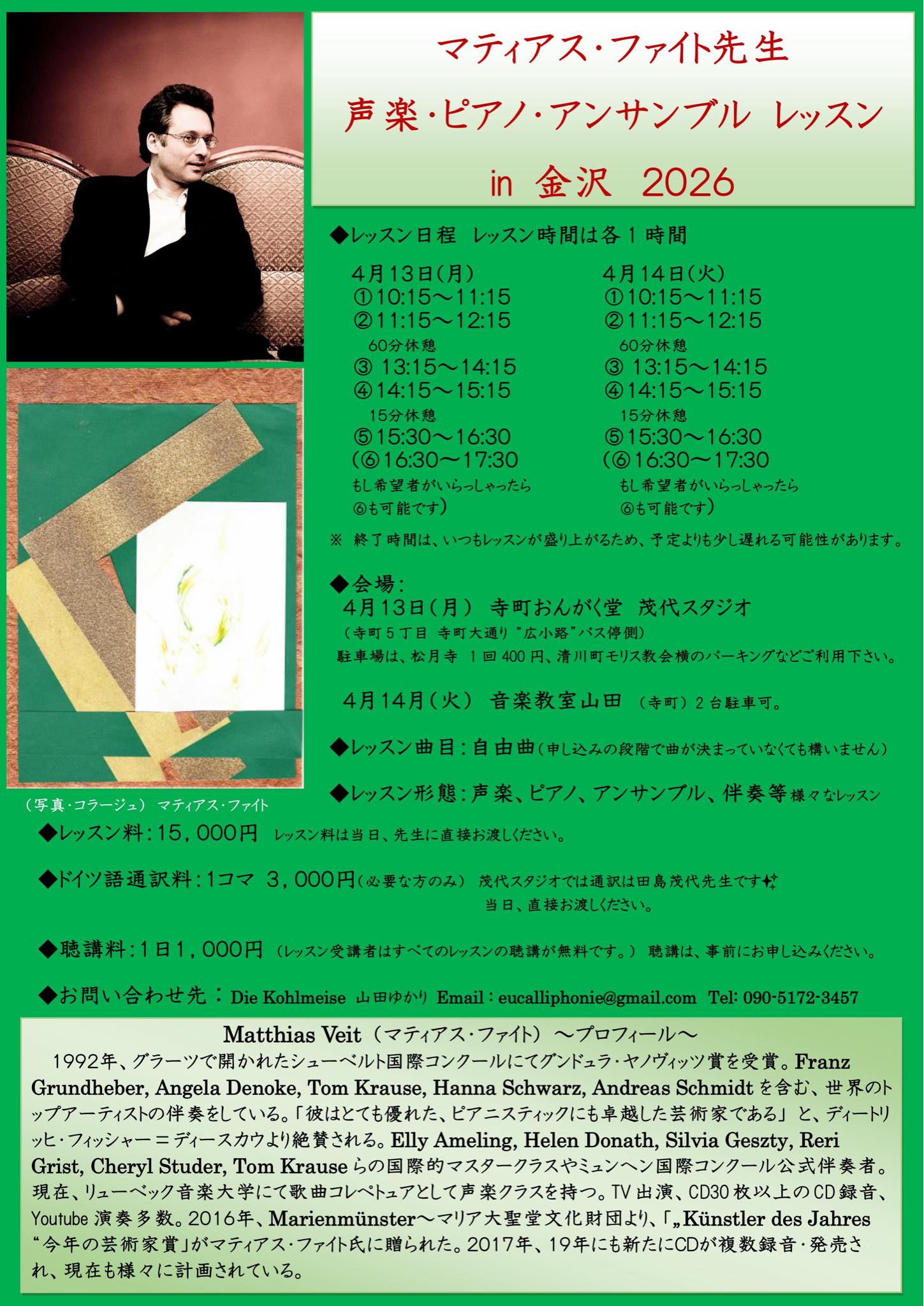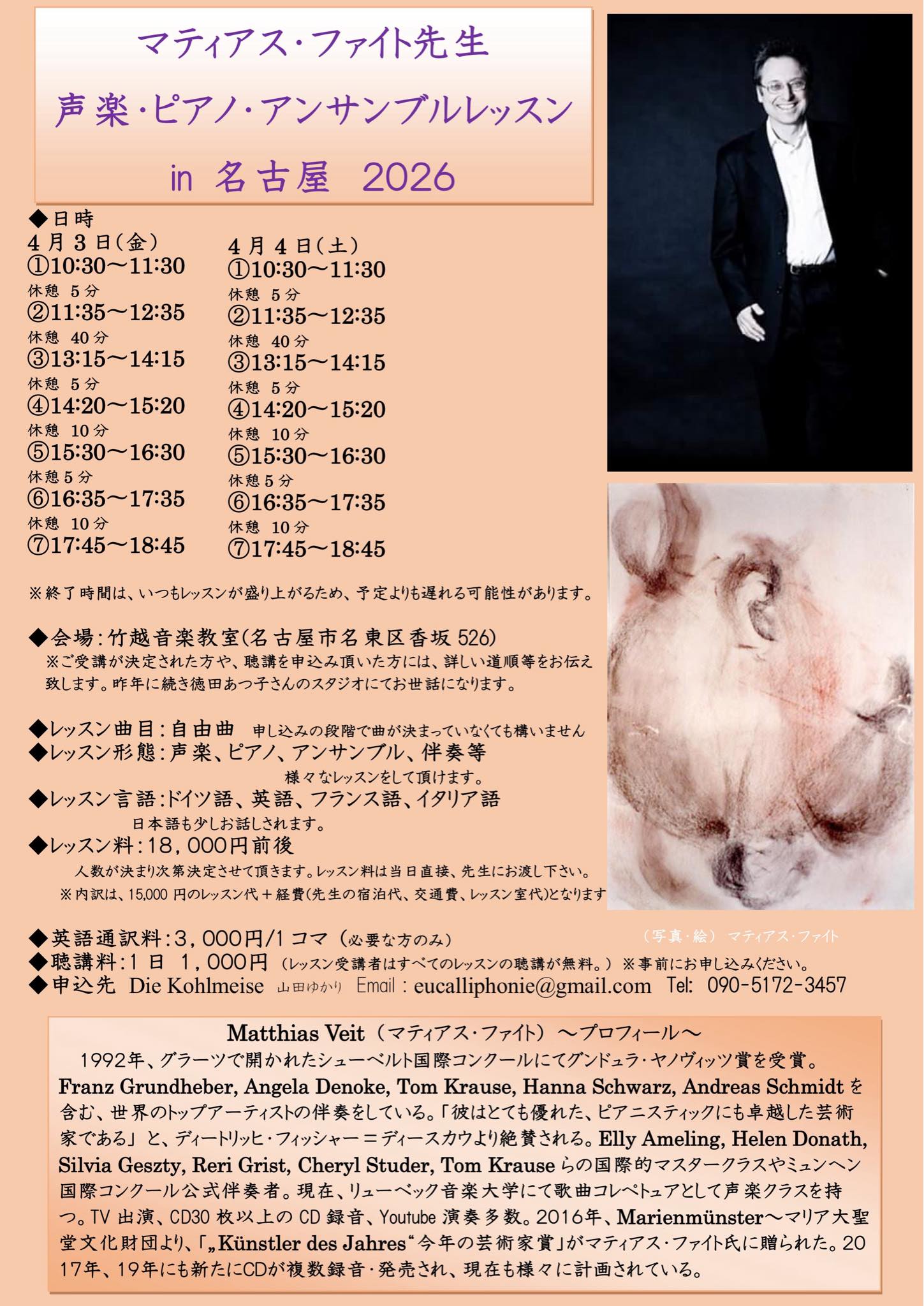 各イベントのご予約はこちらから送信ください。担当者へお繋ぎ致します。 講習会/西宮 3月20日(祝金)~22日(日) 26日と28日追加しました。 レッスン詳細はこちら ジョイントコンサート西宮 西宮市甲東ホール 感謝の音色~出会いに寄せる音の贈りもの 詳細はこちら レッスン/東京 4月1日(水) レッスン/名古屋 4月3日(金)~4月4日(土) レッスン/金沢 4月13日(月)~4月14日(火) コンサート青森&札幌 4月7日(火)札幌